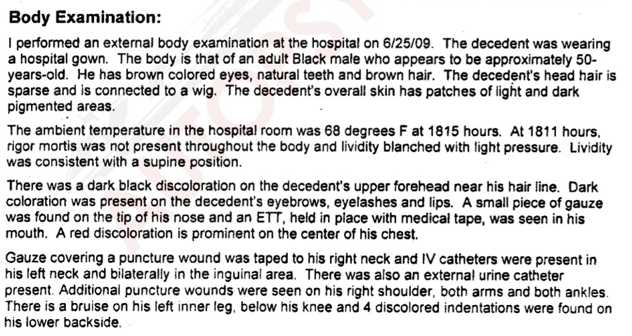 The prevailing question on everyone’s mind that day was how did Michael Jackson die? What happened that caused this unanticipated death? The only way to get an answer was to do an autopsy. I’m sure most people know what an autopsy is, but for the sake of ensuring that all of us are on the same page, let me break it down for you. Also known as a post-mortem examination, an autopsy is a highly specialized surgical procedure that consists of a thorough examination of a corpse by dissection to determine the cause and manner of its death. A pathologist usually performs autopsies, and because Michael Jackson was so famous, his report was published for the world to see. In preparing for this blog, I happened to gloss over a few pages of this document, and I was shocked at what I found. Here’s a brief excerpt of the report.